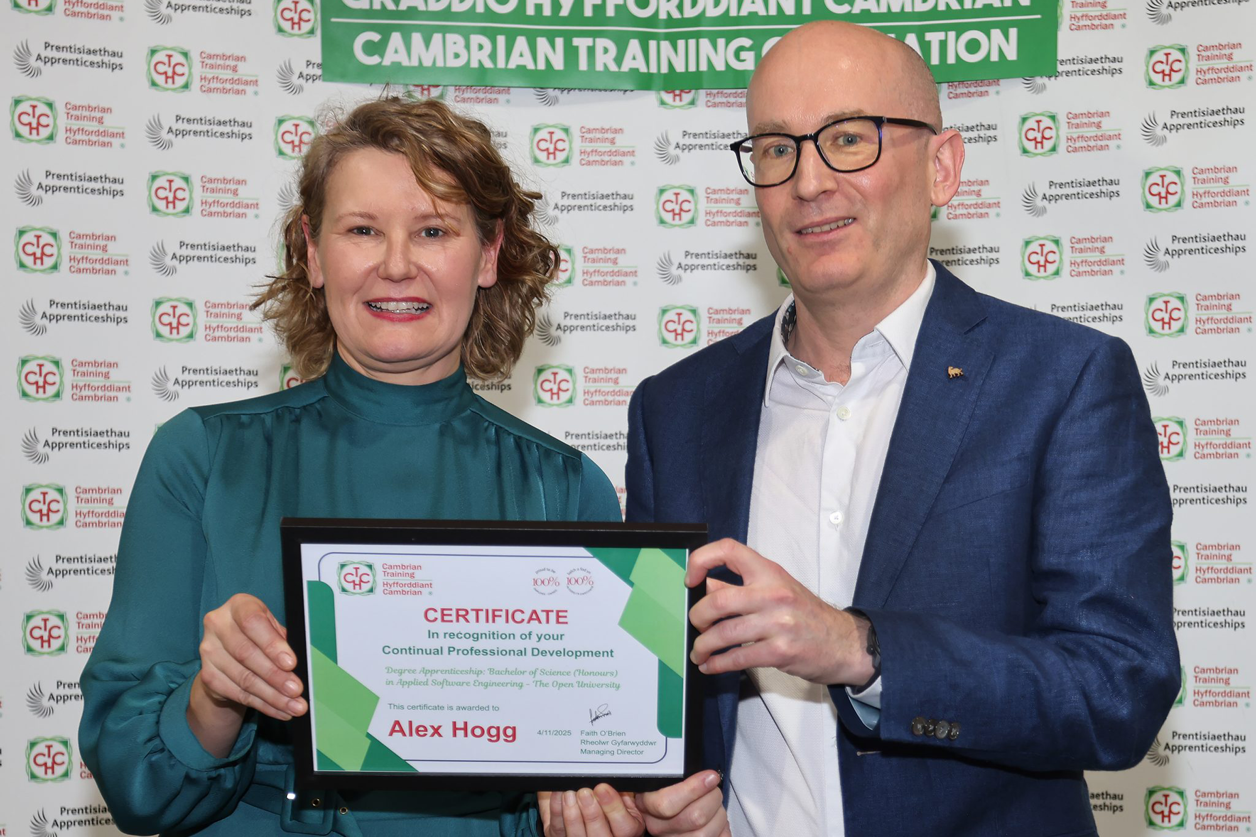 Taith Prentisiaeth Alex Hogg Yng Nghwmni Hyfforddiant Cambrian, rydym yn falch iawn o ddathlu cyflawniad eithriadol Alex Hogg, sydd wedi cwblhau Gradd Prentisiaeth gyda’r Brifysgol Agored, gan raddio gydag Anrhydedd Dosbarth Cyntaf mewn Peirianneg Meddalwedd Gymhwysol. Mae Alex, 43, wedi bod yn aelod gwerthfawr o’n tîm yn y Trallwng ers 17 mlynedd. Mae ei daith… Read more »